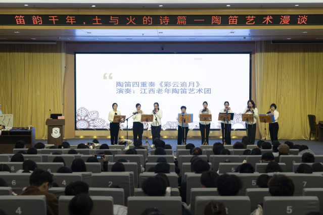 讲座尾声,江西老年陶笛艺术团与管行陶笛重奏团带来独奏、合奏等多种形式的演出。同学们纷纷表示,此次讲座形式多元,在沉浸式体验中扩宽了艺术视野,进一步增强了对传统音乐文化的认知与兴趣。(文/杨欣怡 图/吴司佩 )