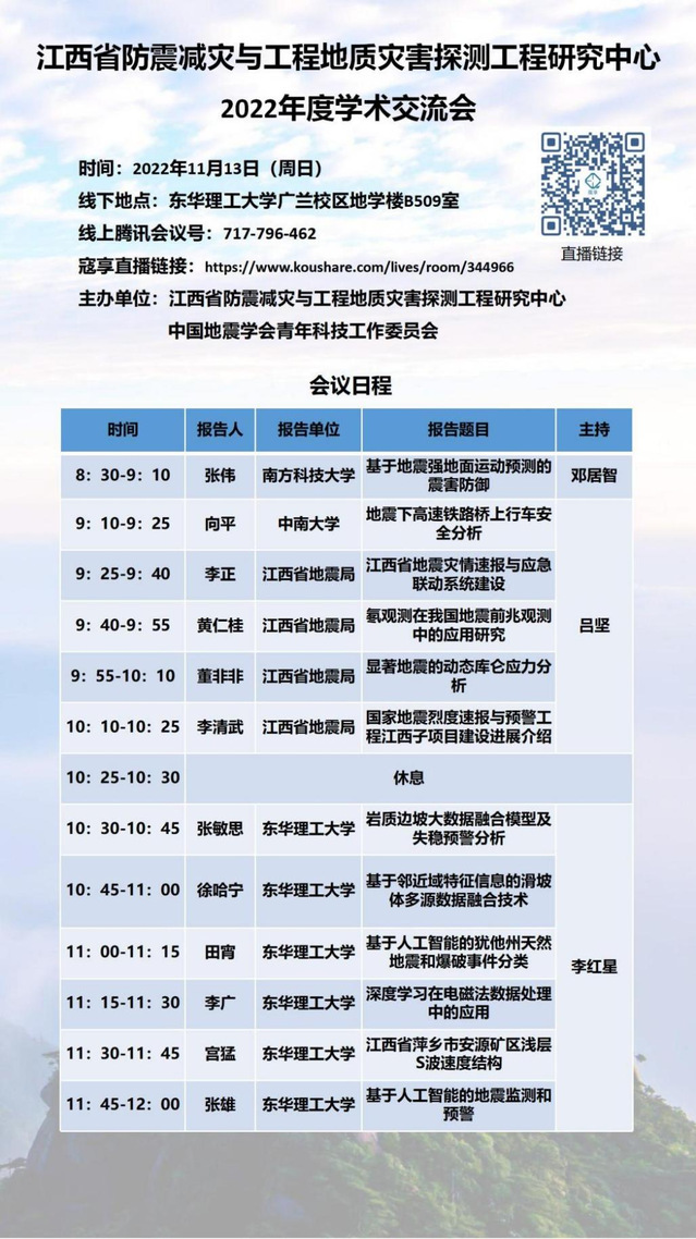 近年来,经济社会的发展对防震减灾与工程地质灾害探测科技提出了更高要求,为了应对日益迫切的现实需求,促进学科发展,江西省防震减灾与工程地质灾害探测工程研究中心定于2022年11月13日在我校地学楼B509报告厅举办2022年度学术交流会。