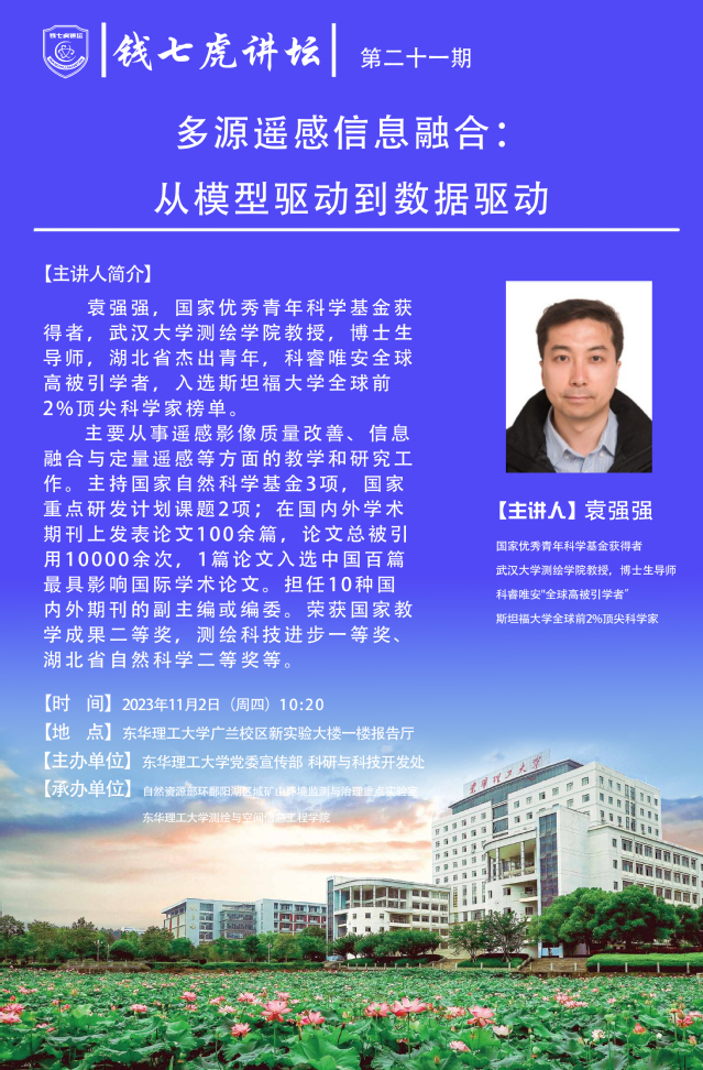 应党委宣传部邀请,国家优秀青年科学基金获得者袁强强教授来到“九游(9Game)官方网站”,以“多源遥感信息融合:从模型驱动到数据驱动”为主题开展讲座。欢迎全校师生届时前往聆听。