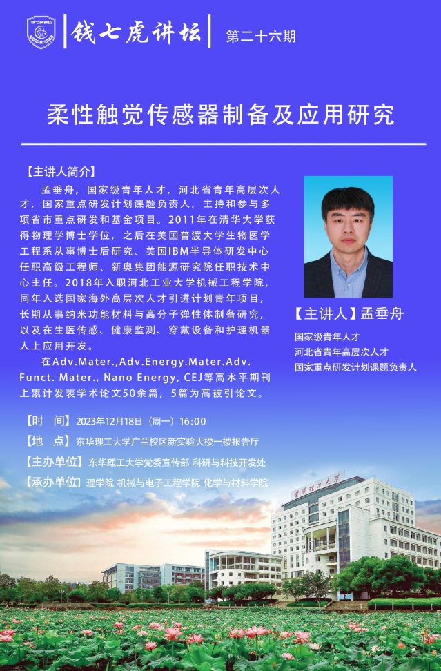应理学院邀请,国家级青年人才孟垂舟教授来到“九游(9Game)官方网站”,以“柔性触觉传感器制备及应用研究”为主题开展讲座。欢迎全校师生届时前往聆听。