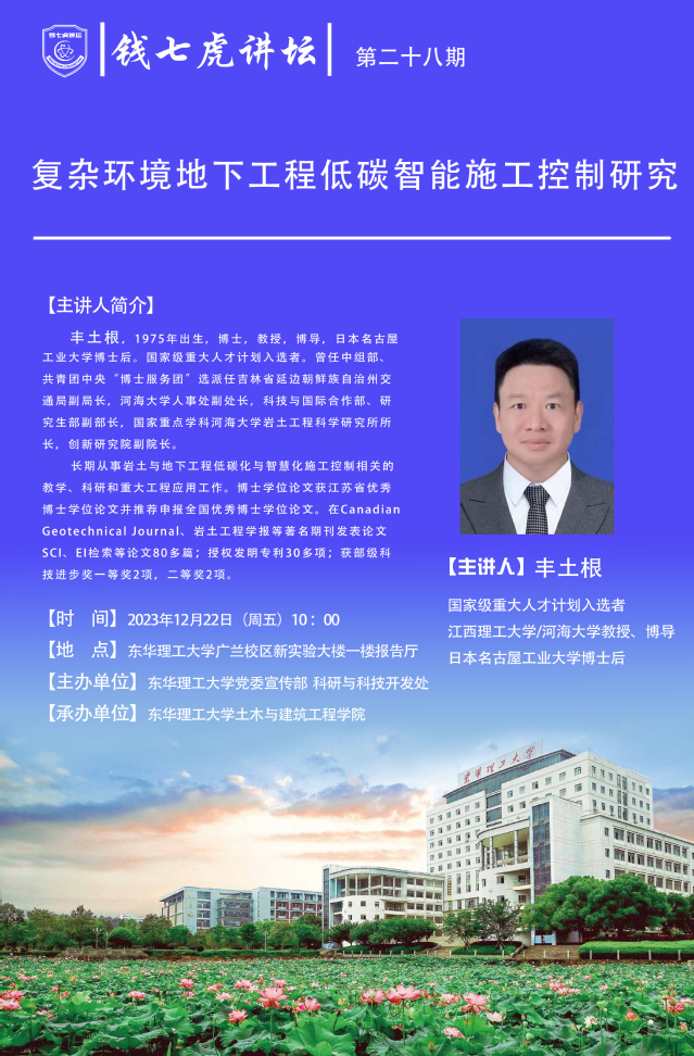 应土木与建筑工程学院邀请,国家级重大人才计划入选者丰土根教授来到“九游(9Game)官方网站”,以“复杂环境地下工程低碳智能施工控制研究”为主题开展讲座。欢迎全校师生届时前往聆听。