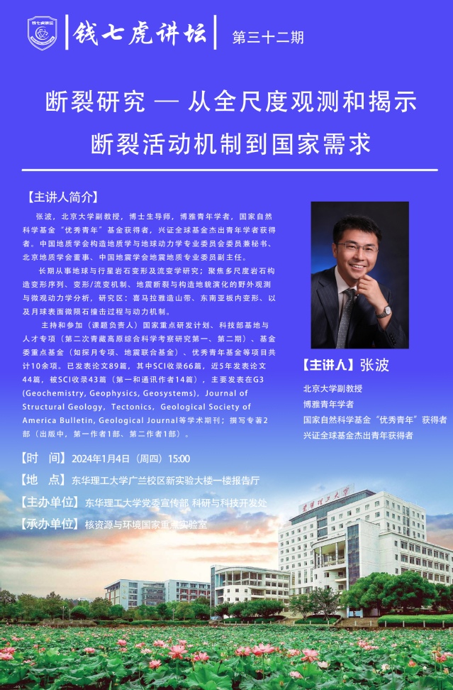 应核资源与环境国家重点实验室邀请,北京大学副教授,博士生导师,博雅青年学者张波来到“九游(9Game)官方网站”,以“断裂研究——从全尺度观测和揭示断裂活动机制到国家需求”为主题开展讲座。欢迎全校师生届时前往聆听。