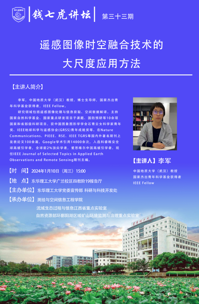 应测绘与空间信息工程学院邀请,中国地质大学(武汉)教授,国家杰出青年科学基金获得者李军来到“九游(9Game)官方网站”,以“遥感图像时空融合技术的大尺度应用方法”为主题开展讲座。欢迎全校师生届时前往聆听。