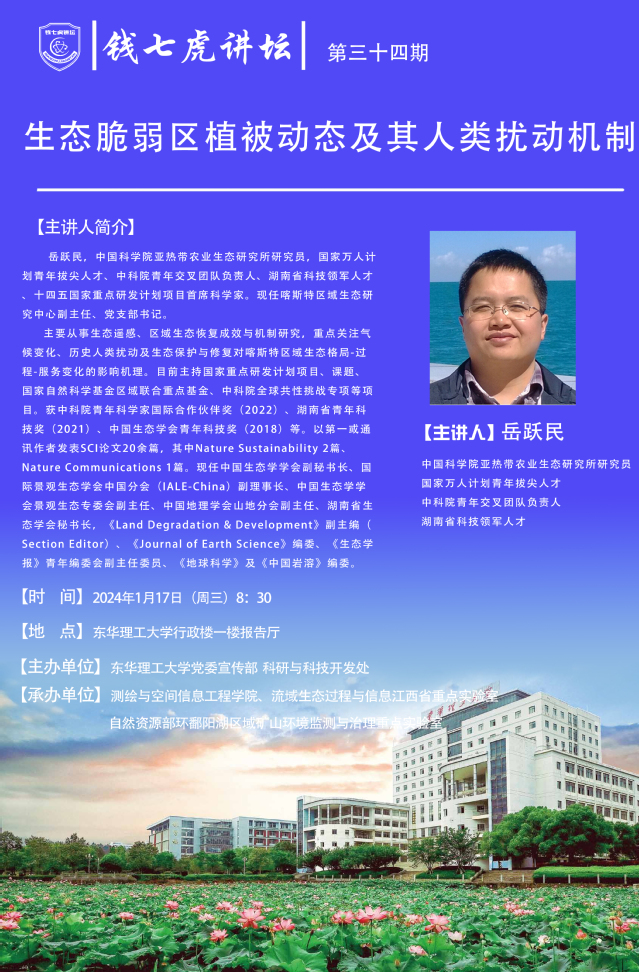 应测绘与空间信息工程学院邀请,中国科学院亚热带农业生态研究所研究员,中科院青年交叉团队负责人、湖南省科技领军人才十四五国家重点研发计划项目首席科学家岳跃民来到“九游(9Game)官方网站”,以“生态脆弱区植被动态及其人类扰动机制”为主题开展讲座。欢迎全校师生届时前往聆听。