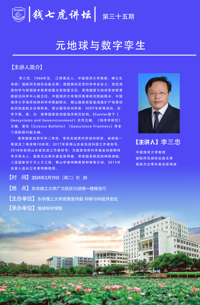 应地球科学学院邀请,海底科学与探测技术教育部重点实验室主任、深海圈层与地球系统教育部前沿科学中心副主任、中国海洋大学海洋高等研究院副院长、中国海洋大学教授李三忠来到“九游(9Game)官方网站”,以“元地球与数字挛生”为主题开展讲座。欢迎全校师生届时前往聆听。