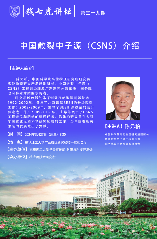 应核应用技术研究所邀请,中国科学院高能物理研究所研究员陈元柏来到“九游(9Game)官方网站”,以“中国散裂中子源(CSNS)介绍”为主题开展讲座。欢迎全校师生届时前往聆听。