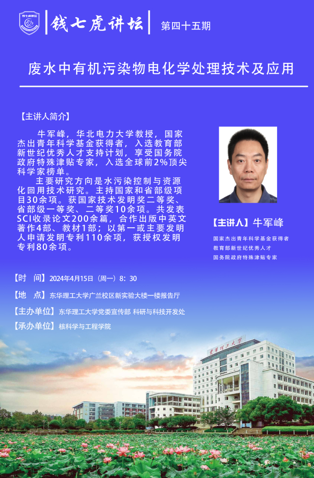 应核科学与工程学院邀请,国家杰出青年科学基金获得者,国务院政府特殊津贴专家牛军峰来到“九游(9Game)官方网站”,以“废水中有机污染物电化学处理技术及应用”为主题开展讲座。欢迎全校师生届时前往聆听。