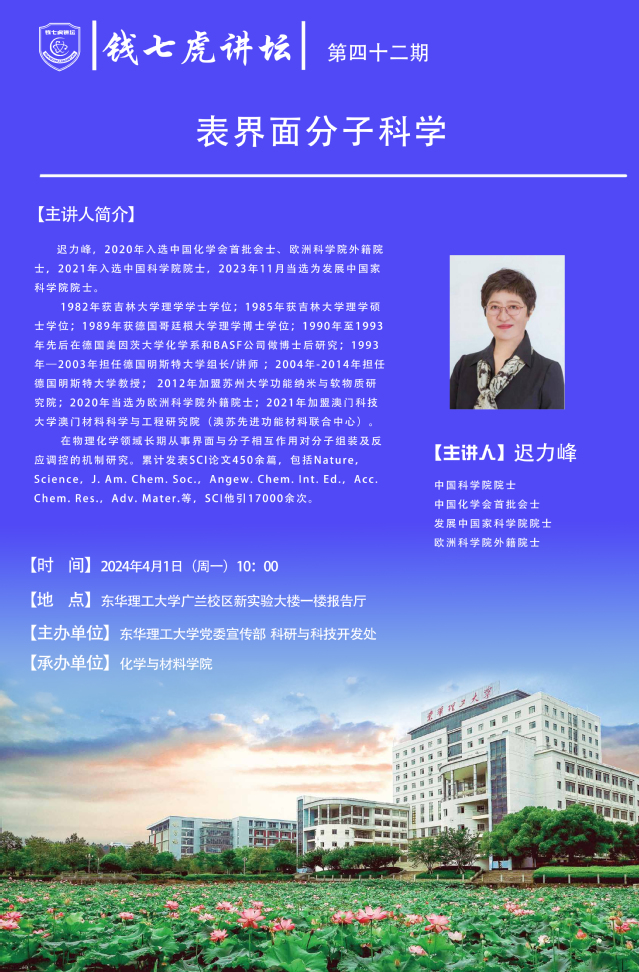 应化学与材料学院邀请,中国科学院院士迟力峰来到“九游(9Game)官方网站”,以“表界面分子科学”为主题开展讲座。欢迎全校师生届时前往聆听。