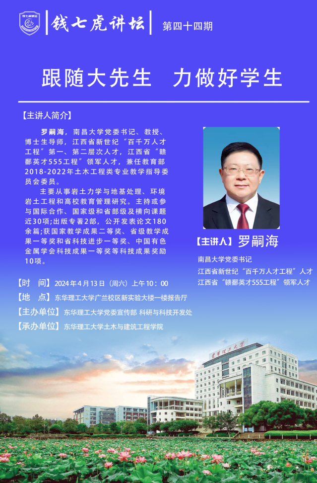 应土木与建筑工程学院邀请,南昌大学党委书记、江西省新世纪“百千万人才工程”第一、第二层次人才罗嗣海到“九游(9Game)官方网站”,以“跟随大先生力做好学生”为主题开展讲座。欢迎全校师生届时前往聆听。