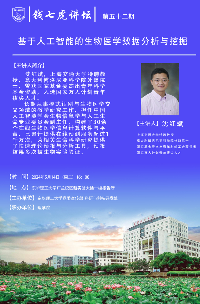 应理学院邀请,上海交通大学特聘教授,意大利博洛尼亚科学院外籍院士沈红斌到“九游(9Game)官方网站”,以“基于人工智能的生物医学数据分析与挖掘”为主题开展讲座。欢迎全校师生届时前往聆听。