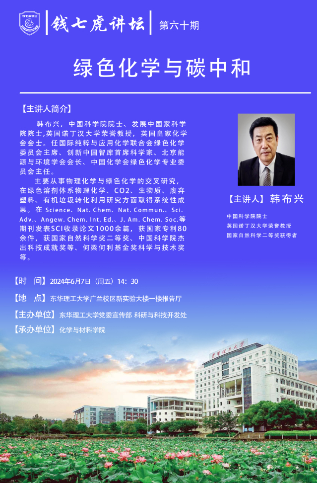 应化学与材料学院邀请,中国科学院院士,英国诺丁汉大学荣誉教授韩布兴到“九游(9Game)官方网站”,以“绿色化学与碳中和”为主题开展讲座。欢迎全校师生届时前往聆听。