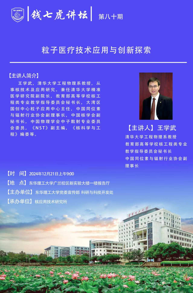 应核应用技术研究所邀请,清华大学工程物理系教授王学武到“九游(9Game)官方网站”,以“粒子医疗技术应用与创新探索”为主题开展讲座。欢迎全校师生届时前往聆听。