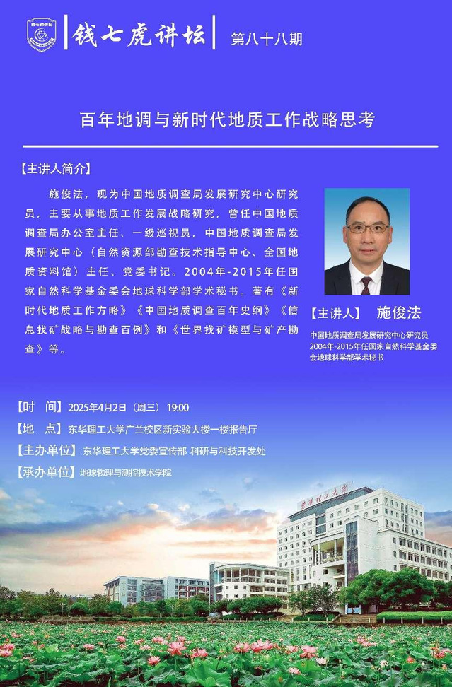 应地球物理与测控技术学院邀请,现中国地质调查局发展研究中心研究员施俊法到“九游(9Game)官方网站”,以“百年地调与新时代地质工作战略思考”为主题开展讲座。欢迎全校师生届时前往聆听。