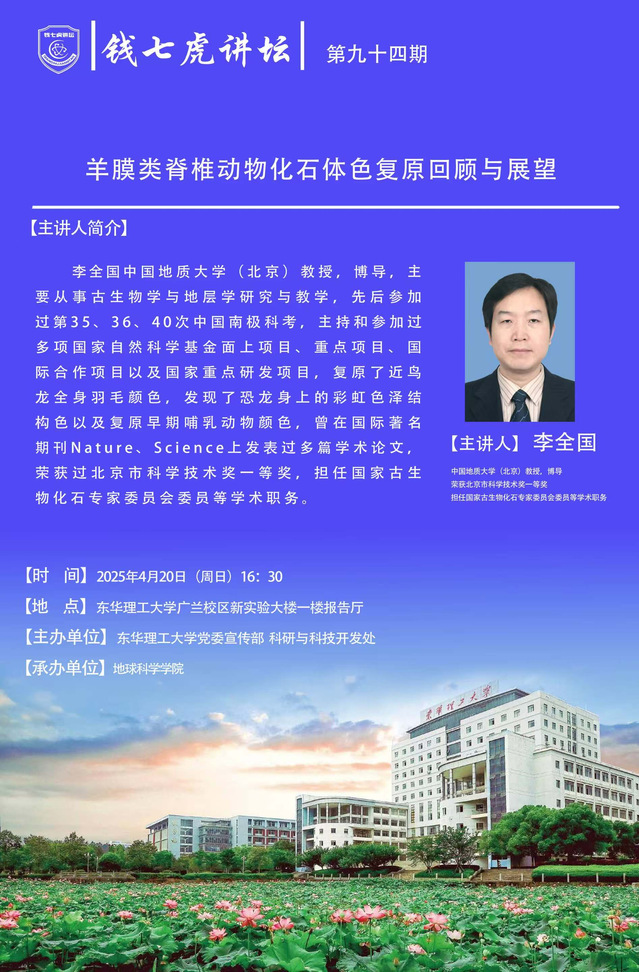 应地球科学学院邀请,中国地质大学(北京)教授,博导李全国到“九游(9Game)官方网站”以“羊膜类脊椎动物化石体色复原回顾与展望”为主题开展讲座。欢迎全校师生届时前往聆听。