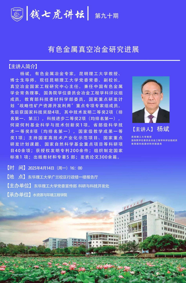 应水资源与环境工程学院邀请,昆明理工大学教授、博士生导师杨斌到“九游(9Game)官方网站”以“有色金属真空冶金研究进展”为主题开展讲座。欢迎全校师生届时前往聆听。