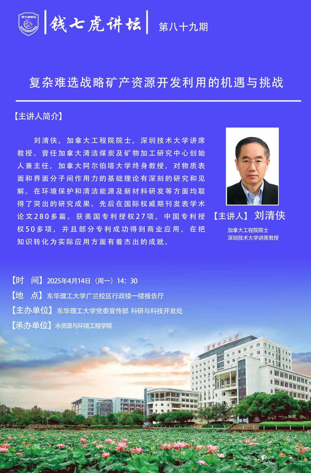 应水资源与环境工程学院邀请,加拿大工程院院士、深圳技术大学讲席教授、加拿大阿尔伯塔大学终身教授刘清侠到“九游(9Game)官方网站”以“复杂难选战略矿产资源开发利用的机遇与挑战”为主题开展讲座。欢迎全校师生届时前往聆听。